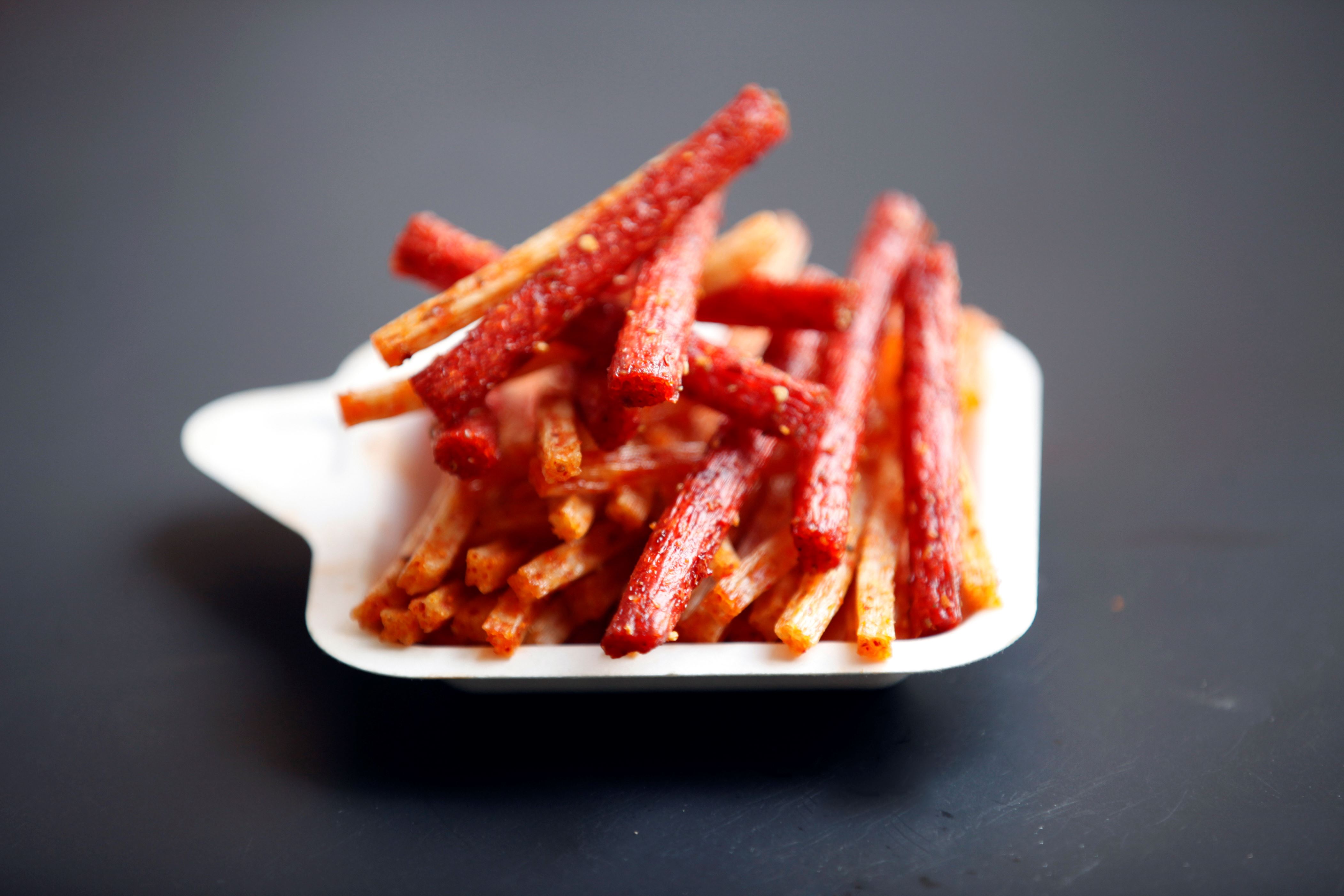 但是,包装食品并不会标示盐的具体用量,而是在营养成分表中用钠来标注。1克盐约等于393毫克钠,成人每日钠的参考摄入量为2000毫克。以这个标准来计算,每100克网红辣条、素毛肚、鸭脖等零食,钠的占比可达到标准摄入总量的75%~130%,高的甚至达到150%以上。