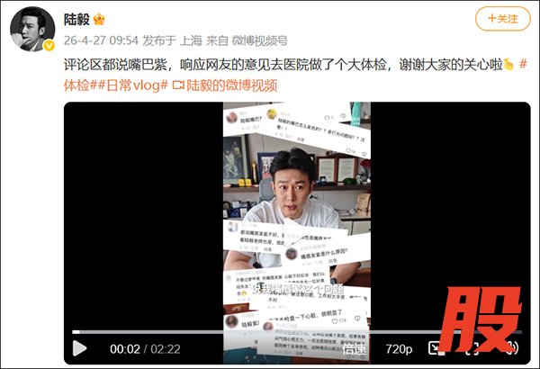 4月27日,演员@陆毅 在社交平台上发体检视频,配文称,“评论区都说嘴巴紫,响应网友的意见去医院做了个大体检,谢谢大家的关心啦!”